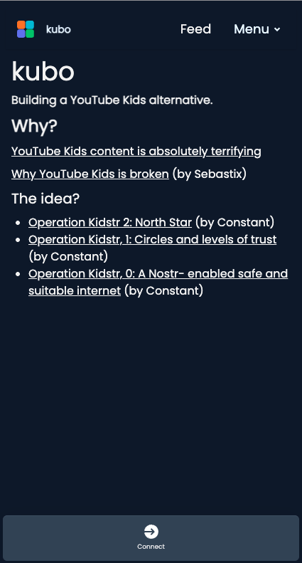 Part of our Web of Trust foundation initiative, we're working on a project called Kubo.watch. The goal is to build a Nostr application for our youngsters and to have a YouTube Kids alternative (because YouTube Kids is broken) where parents have full agency over the media content their children are interacting with.